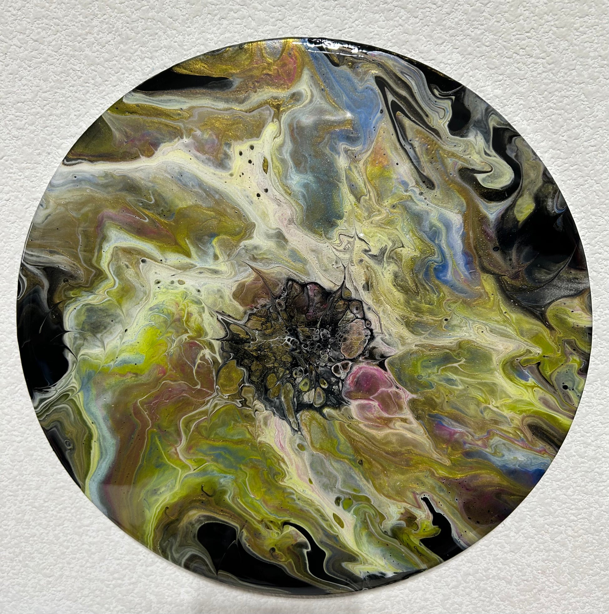 12” wood round canvas. Abstract acrylic pour with resin finish.