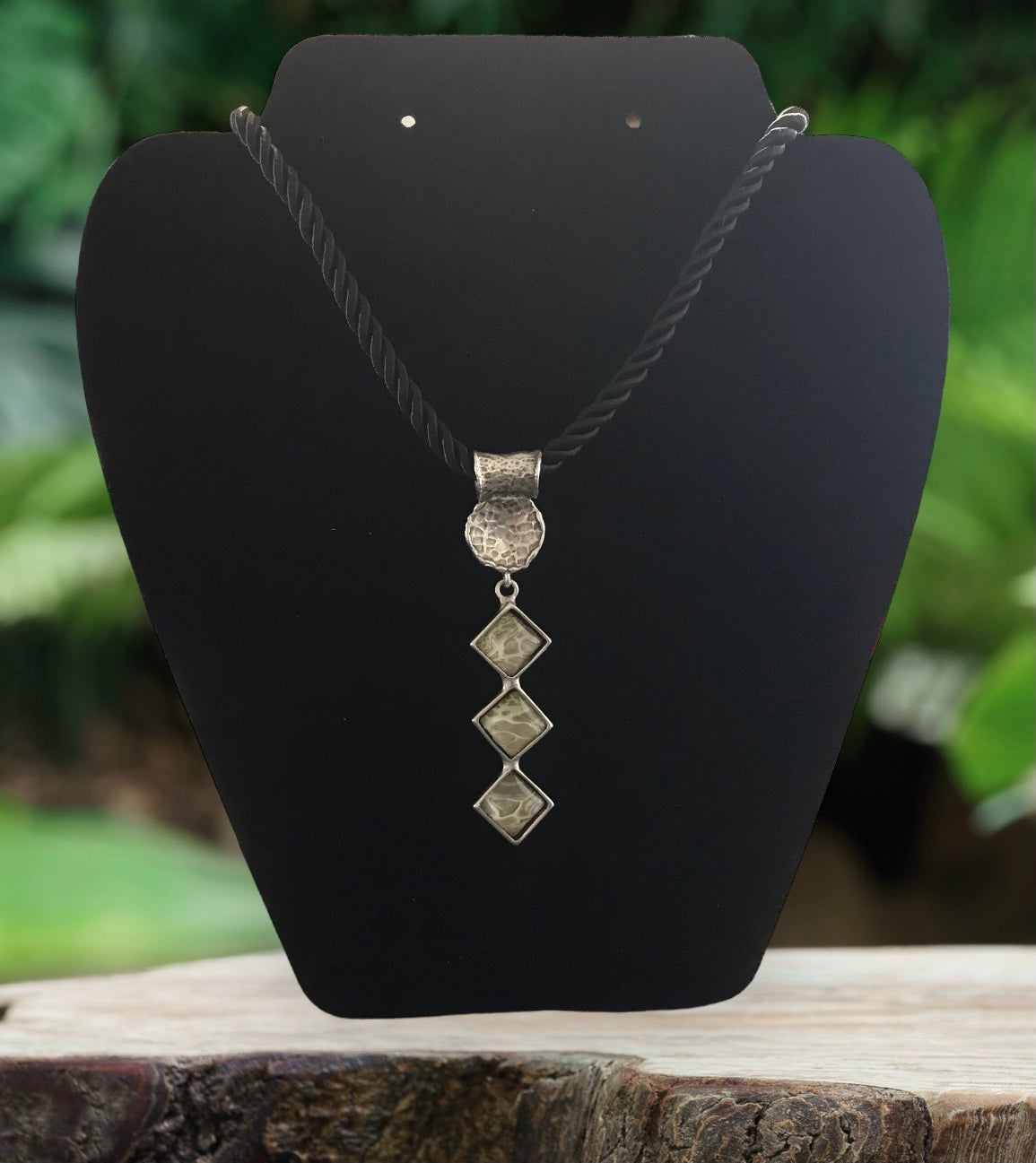 Hammered metal setting with acrylic pour painting under glass cabachons placed into the jewelry tray Pendant measures 2.5” and has a 20” silk rope with metal fastenings.
