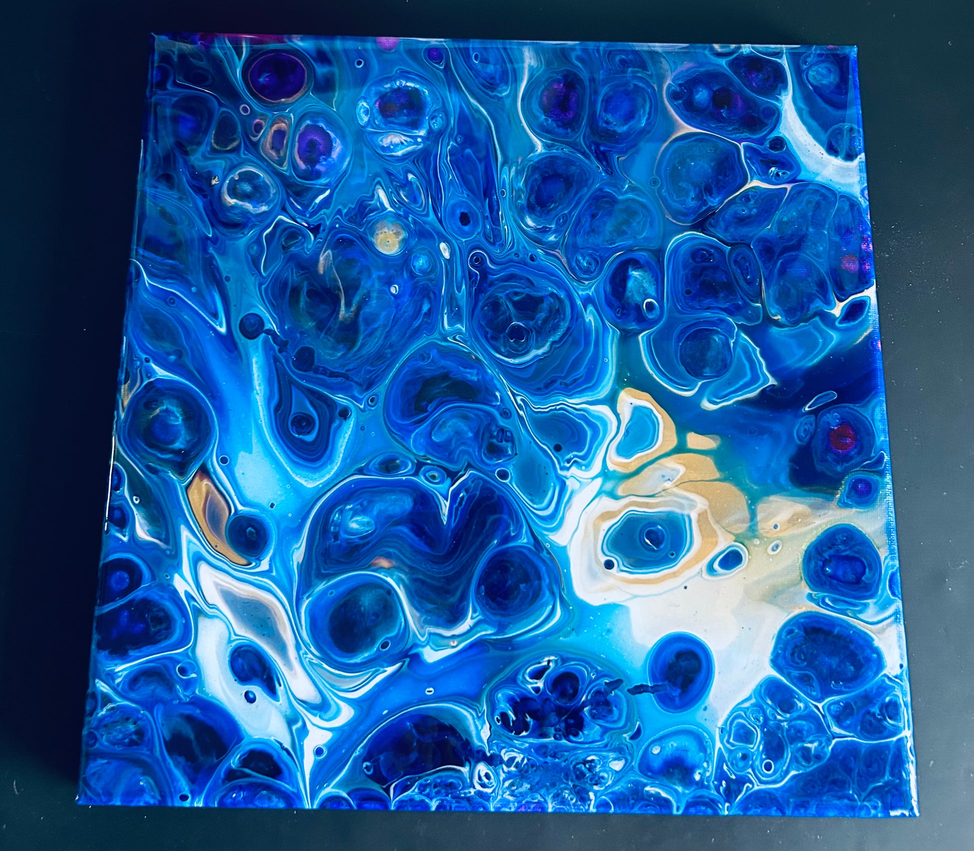 12x12” Acrylic on Canvas Abstract acrylic pour painting. It is finished in resin and can be placed in a frame if desired, at a added cost of $18