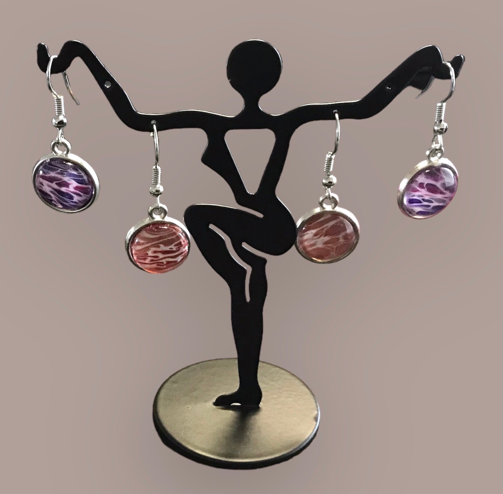 1” drop earrings with acrylic pour inset covered with a glass cabochon.
