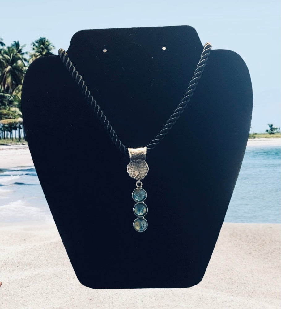 Hammered metal setting with acrylic pour painting under glass cabachons placed into the jewelry tray Pendant measures 2.5” and has a 20” silk rope with metal fastenings.