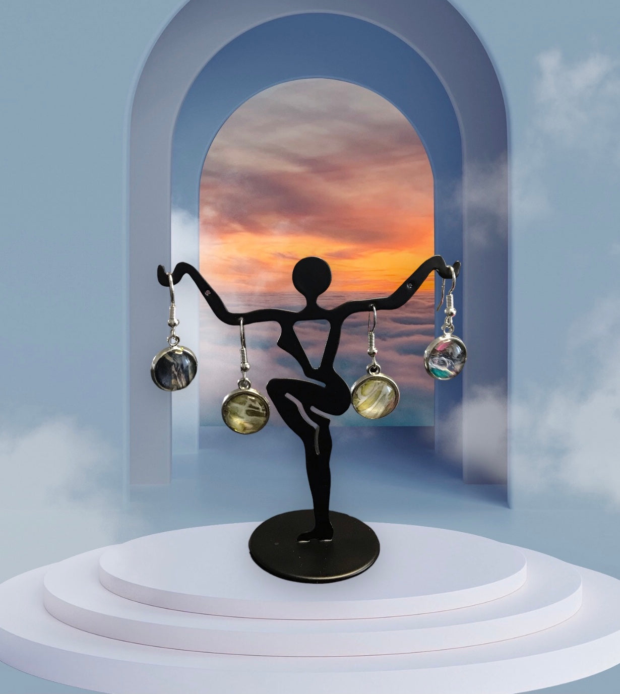 1” drop earrings with acrylic pour inset covered with a glass cabochon.